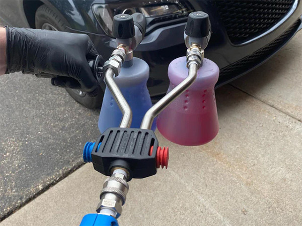 The MTM Mezzo Valve is the newest addition to our evolving line of pressure washing solutions. The Mezzo valve provides a two-way shuttle valve system in a sleek lightweight style. It is full shut-off when engaged on one side or the other which offers full pressure on the left or right side. This cleaning method is perfect for a consolidated gun and lance system that is popular among detailers for its compact design. Derived from the Italian word for ‘Middle,’ this valve serves as an intermediary two-way system, replacing the need for a three-way ball valve and allows the user to keep their foam cannon and nozzle in one place.
