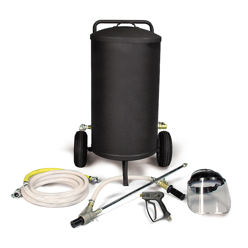 For the extra-tough cleaning jobs, wet-sandblasting is the dust-free solution. Sandblasters attach to a hot or cold water pressure washer and, using a venturi, mixes sand or other abrasive media with the high-pressure spray. This creates enough cleaning power to strip paint off concrete and barnacles from a ship’s hull. The sandblasting nozzle head is made of tungsten carbide for long life. Be sure to use the correct size pressure washer with the the Industrial Sandblast System.