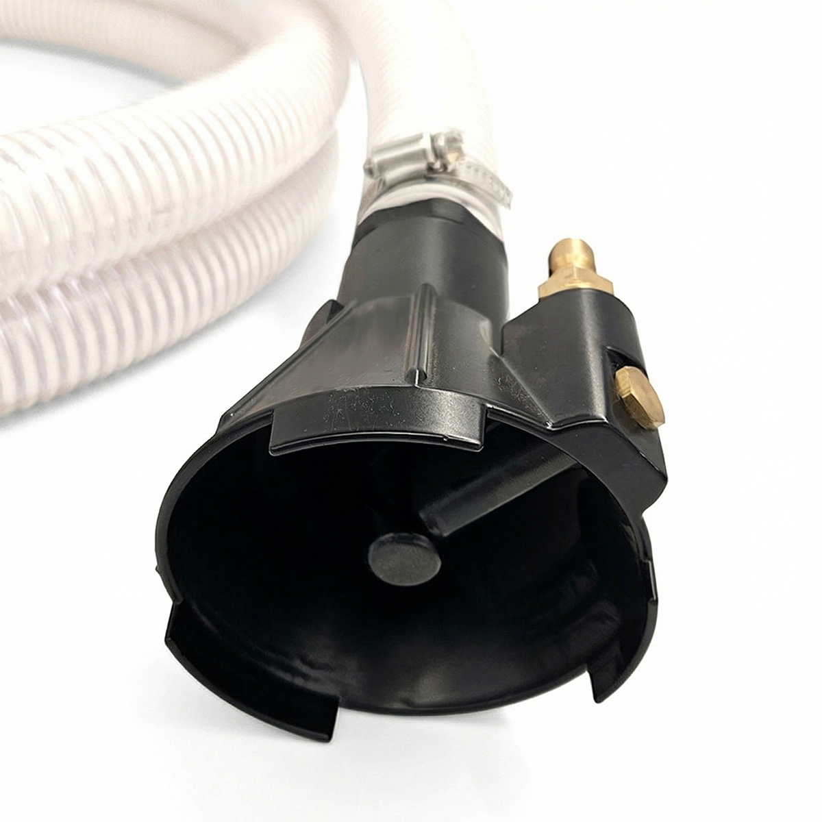 Uses a 0° tip for suction / power ejection. Plus it’s easy to change for different pluming system flows and pressures.