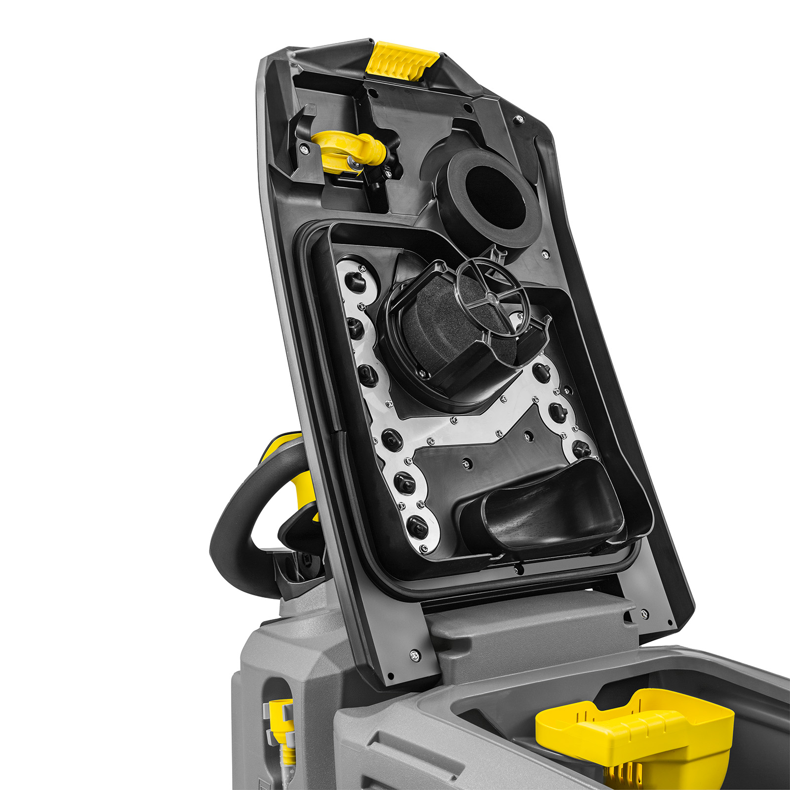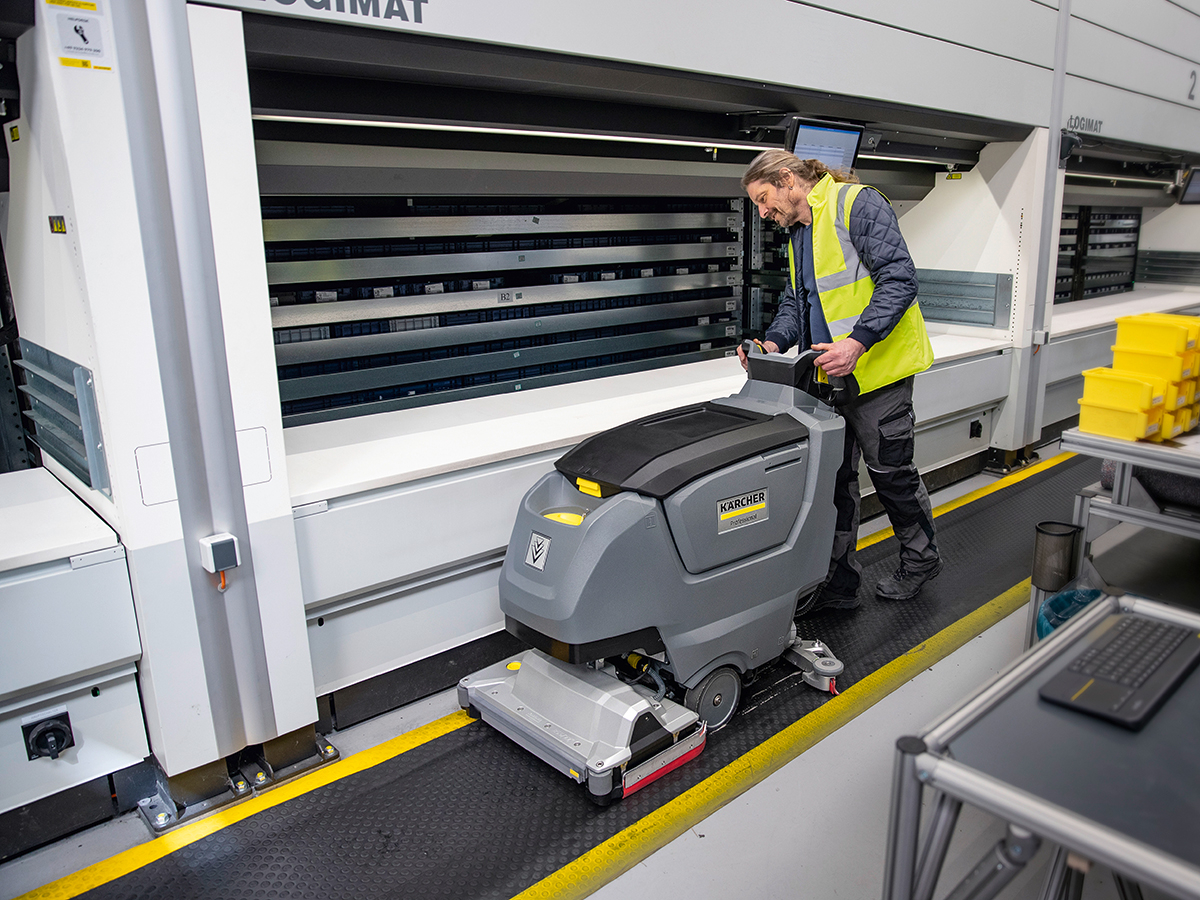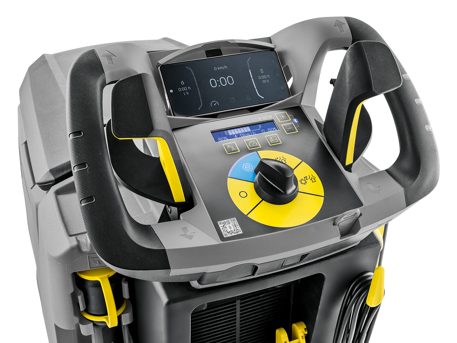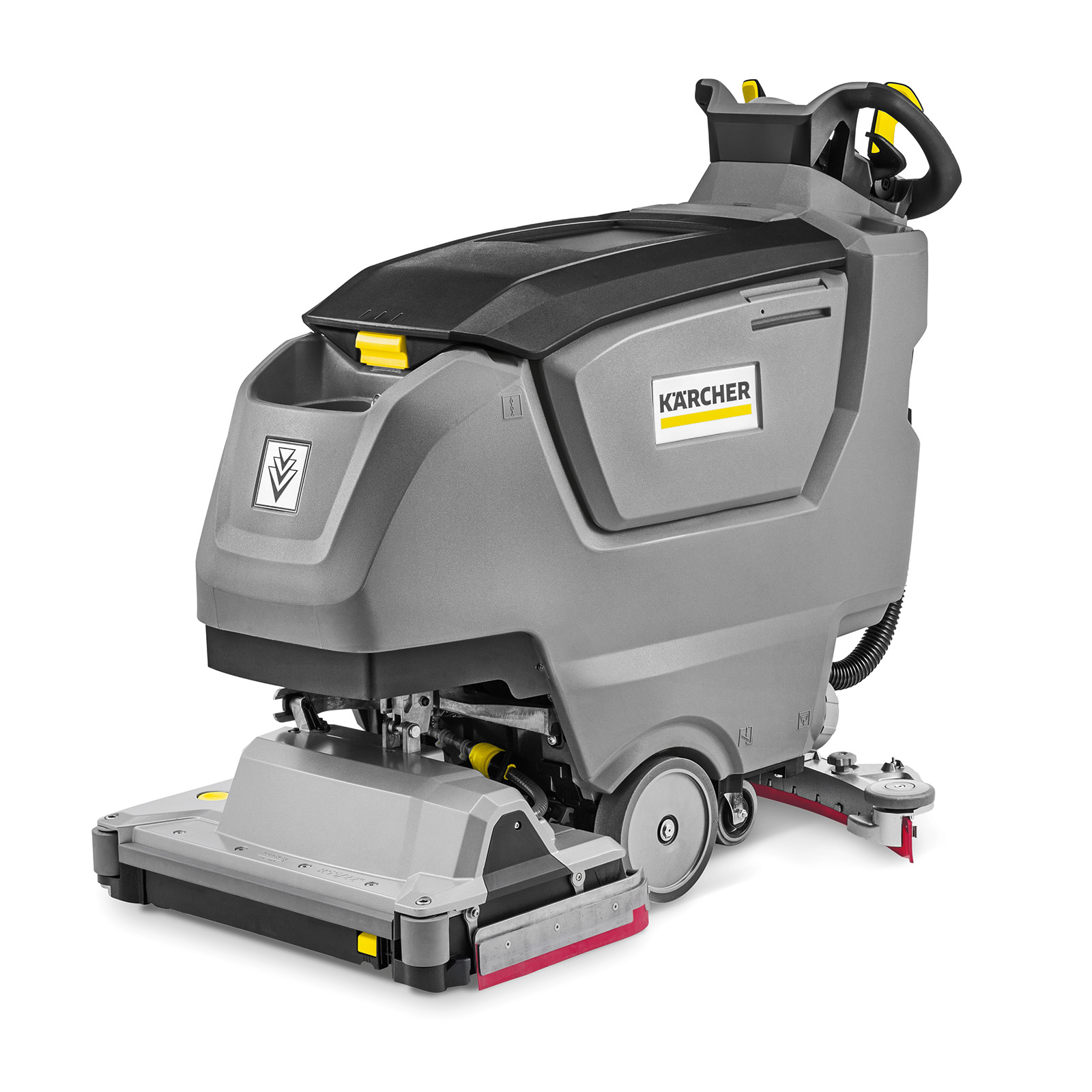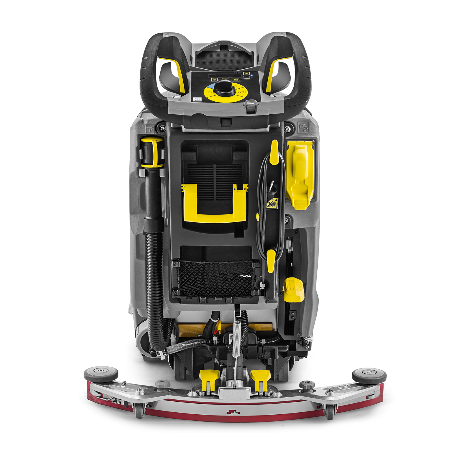 The B 50 W Bp walk-behind scrubber is the ideal companion for fast and efficient wet cleaning of floors and hard surfaces. It delivers cutting-edge cleaning technology in a slim design. The B 50 W sets new standards, with its reworked design and power units ensuring impeccable cleaning results over an area of up to 18,200 square feet. The machine can be powered by a choice of AGM or Lithium batteries. Easy to operate, quiet and efficient, the B 50 W is the perfect companion for real pros. The brush head and squeegee assembly are made from cast aluminum, making the walk-behind machine extremely durable and sturdy. The parabolic squeegee ensures perfect suction, even on uneven surfaces and in tight turns. The R 55 cylindrical brush head ensures thorough and powerful cleaning – especially on textured surfaces. The auto-rinse function enables contact-free cleaning of the dirty water tank, and topping up the freshwater tank is a breeze with the universal filling hose, allowing easy access to fresh water from any tap.