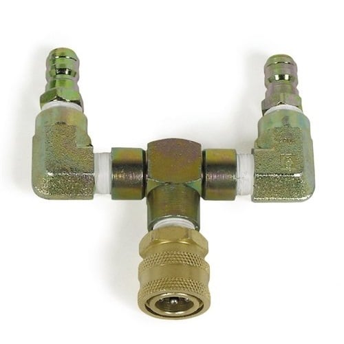 The Two-Gun Tee Coupler is a quick solution to convert a one-gun pressure washer into a two-gun system. Ideal for pressure washers producing more than 4.0 GPM, simply quick connect this 2 Gun Coupler onto the pressure washer outlet nipple, then connect two pressure washer hoses to either end of the 2-gun splitter. Allows for 2 pressure washer users simultaneously!