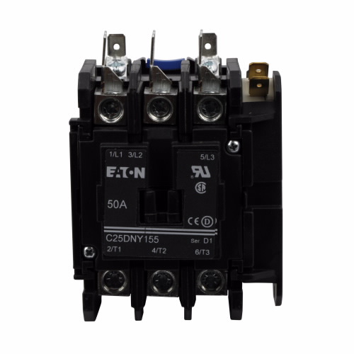 The 8.724-282.0 Eaton DP Contactor C25DNY155BL is rated for 230V, 50 Amps.  This Definite Purpose Control Contactor is UL Recognized and CSA Certified.