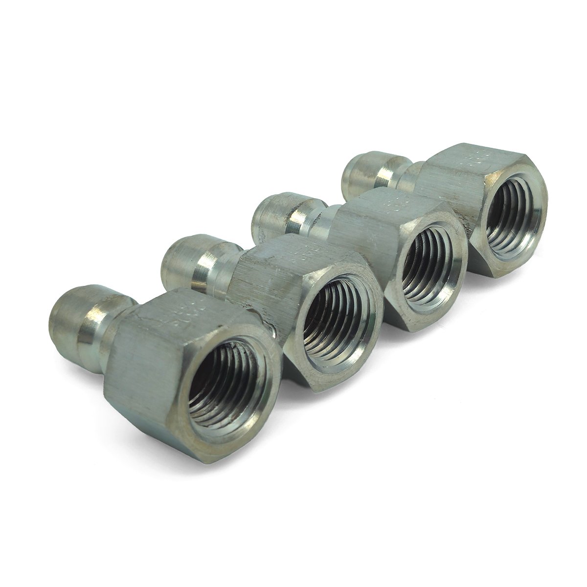 This handy tool allows you to quickly switch between four different nozzles on a spray gun wand. It accepts 1/4″ NPT-M thread spray nozzles and turns each into a quick connect tip.