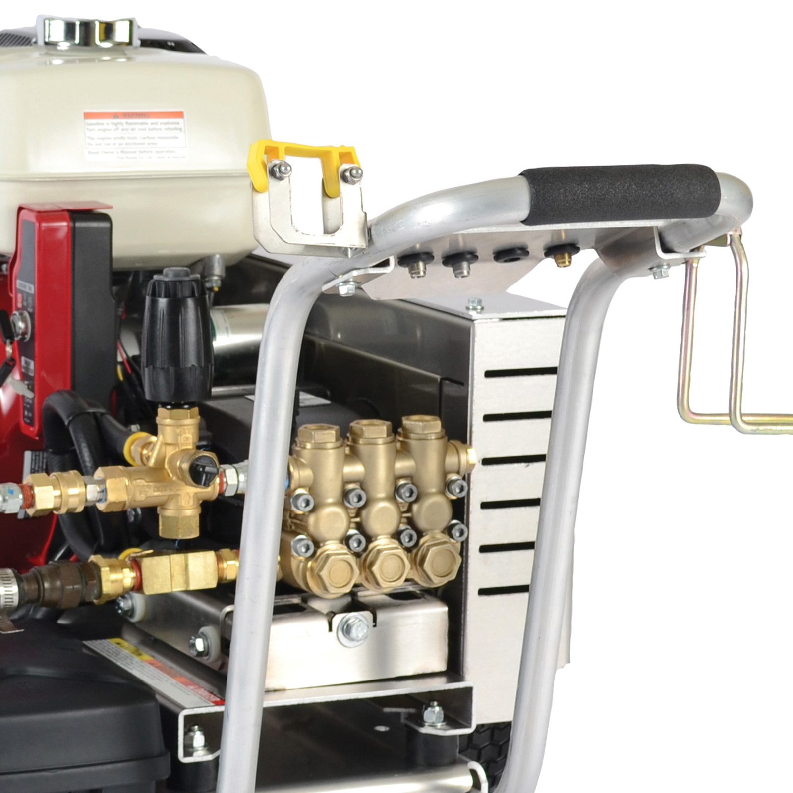 The HD Plus Series are Hotsy’s modular cold water pressure washers with corrosion resistant aluminum frame. Wheels can be removed allowing for easy trailer mounting. This model is available with a direct drive pump and powered by Honda GX engines. The HD series features a durable VTR3 unloader with bypass loop, commercial duty pump and a 50′ hose.